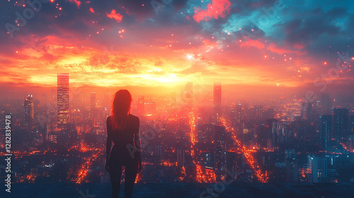 A woman's back silhouette stands on a rooftop, gazing at a futuristic cityscape filled with towering skyscrapers and glowing neon lights under a dark cloudy sky, symbolizing mystery and ambition