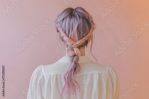 A woman's back view showcases a stylish braided updo with vibrant pink and purple hair against a soft pastel backdrop.