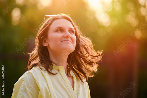 A woman's face against the background of green trees in the park with sunglasses on her hair. Portrait of an adult woman with glasses over her head, age 37