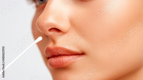 A woman's face during a nasal swab test, highlighting the process of medical diagnosis.