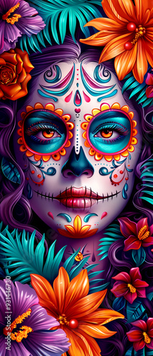 A woman's face is painted with flowers and skulls. The flowers are in various colors and the skull is blue. The woman's face is surrounded by leaves and stems