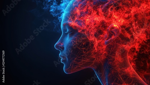 A woman's face is shown in a red and blue color scheme