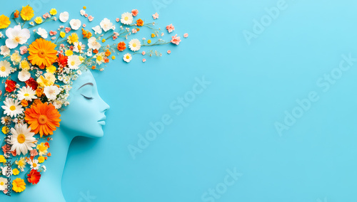 A woman's face is surrounded by flowers and the background is blue. The flowers are orange and yellow