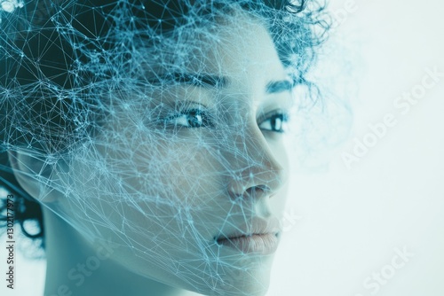 A woman's face overlaid with a network of interconnected lines, representing digital connectivity and the human mind.