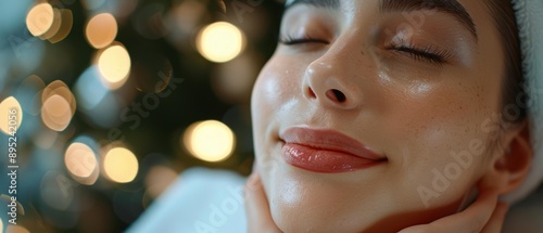 A woman's face with glowing skin, her eyes closed in relaxation. AI.