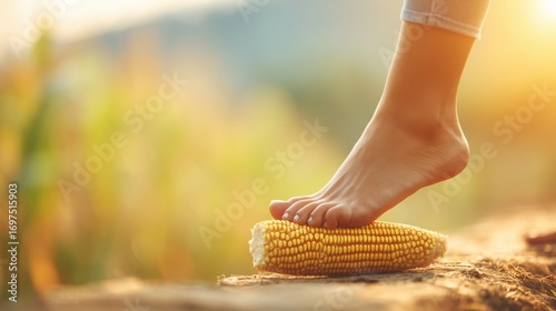 A woman's foot stepping on a corn cob. Female toes and toe tips step on an ear of corn