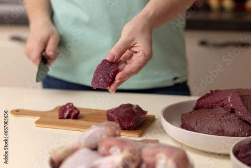 A woman's hand with a piece of beef in close-up. Cooking dinner