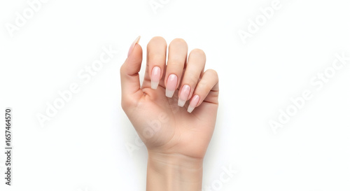 A woman's hand with long coffin shaped nails painted in a nude color on a white background is shown