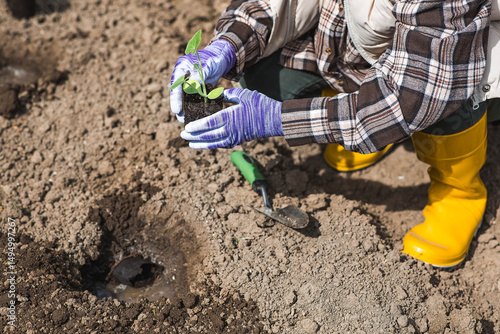 A woman's hands in gardening gloves hold a young plant in the ground. Pumpkin and squash seedlings are planted in the ground. The concept of spring planting of vegetables and agriculture.