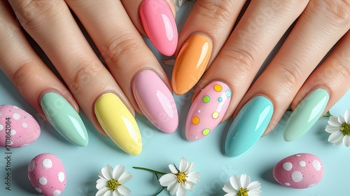 A woman's manicured hands with colorful nail polish, including pink, yellow