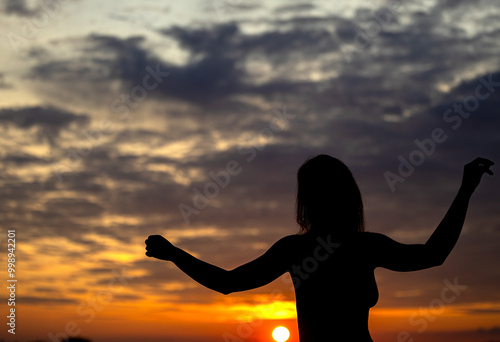 A woman's silhouette against the evening sky, with a stunning autumn-colored sky