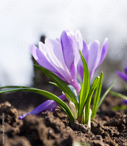 A wonderful spring flower crocus, a brightly colored early decoration of parks and meadows. Amazing crocus flowers.