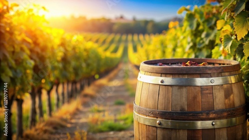 A Wooden Barrel Rests Amidst the Golden Hues of a Vineyard at Sunset