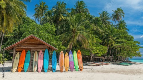A wooden beach hut with colorful surfboards leaning against it, set against a backdrop of palm trees and clear blue skies.