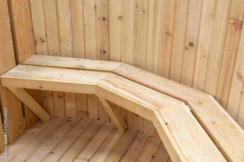 A wooden bench in a semicircle, a wall of planks.