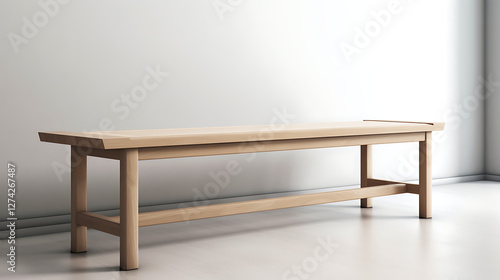 A wooden bench is sitting in a room with a white wall