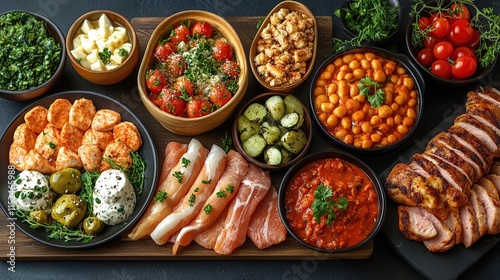 A wooden board filled with various delicious appetizers, including grilled chicken, beans, salads, and cheeses, perfect for a party or gathering.