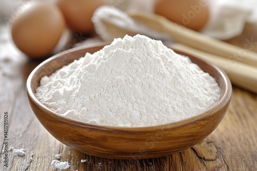 A wooden bowl filled with a mound of white flour, with eggs and utensils visible in the background