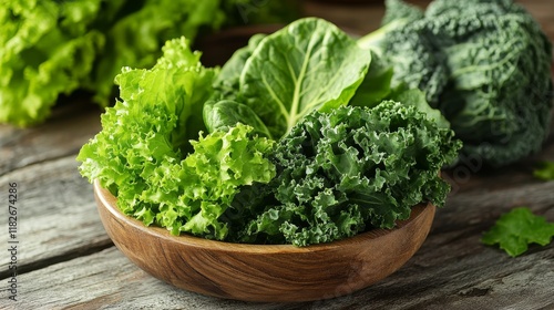 A wooden bowl filled with a variety of fresh greens including lettuce, kale, and collard leaves on a rustic wooden surface