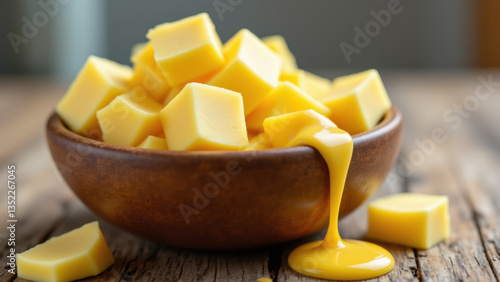 A wooden bowl filled with cubes of melting butter on a rustic table.