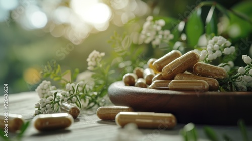 A wooden bowl filled with pills and flowers. Can be used to represent the concept of natural remedies or the contrast between medicine and nature
