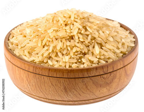 A wooden bowl overflowing with uncooked, golden-brown grains, isolated