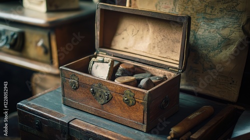 A wooden box with a lid and open top, filled with coins and other small items, sits on a wooden table.