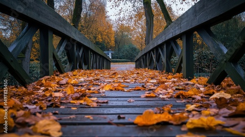A wooden bridge covered in fallen autumn leaves in a park landscape.