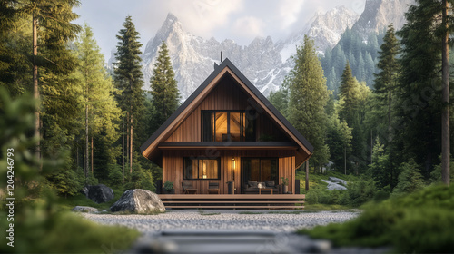 A wooden cabin nestled among trees with a stunning mountain backdrop.