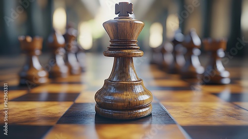 A wooden chess king stands tall on a chessboard, surrounded by other chess pieces in a blurred background.