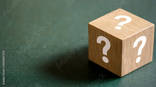 A wooden cube featuring question marks on each visible face, placed on a textured green surface, symbolizes uncertainty, inquiry, and the quest for answers, inviting reflection.