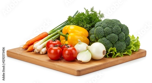 A wooden cutting board with fresh vegetables, isolated on a white background