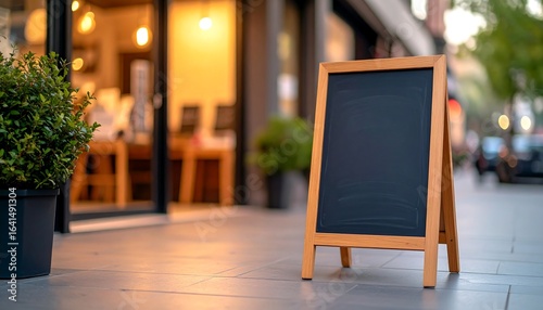 A wooden framed blackboard sign stands on a paved sidewalk in front of a shop