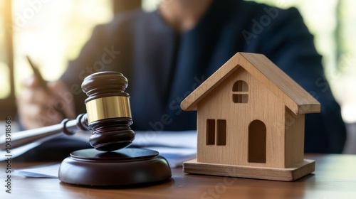 A wooden gavel and a miniature house model on a desk with a blurred background of a person with a pen.