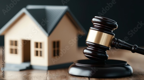 A wooden gavel is positioned next to a small model house, symbolizing legal matters concerning real estate or property law.