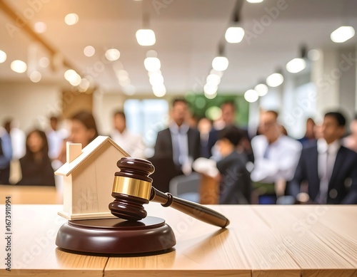 A wooden house model and gavel rest on a table, positioned in front of a blurred gathering of people in business attire.
