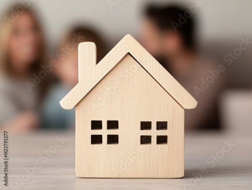 A wooden house model in focus, symbolizing home and family, with blurred figures of people in the background, representing togetherness.