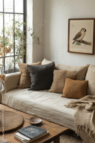 A wooden picture frame with an illustrated baby parrot on it is hanging above the sofa in the living room.