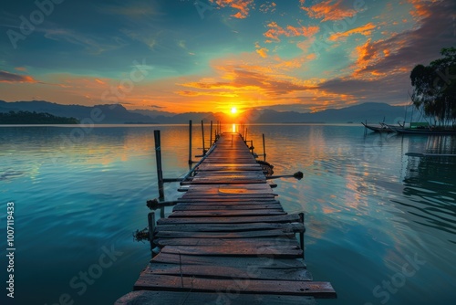 A wooden pier stretches out into the calm water at sunset, perfect for a serene lakeside or coastal scene