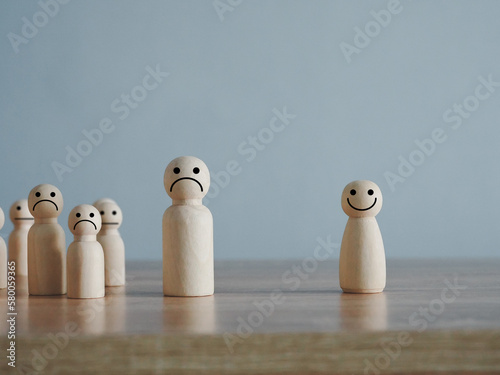 A wooden puppet wooden cube with a happy smiley face. Separating from a society full of frowning or unhappy faces