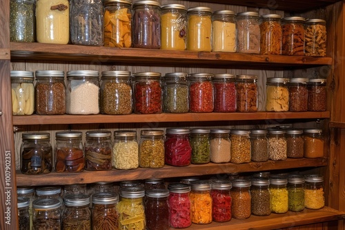 A wooden shelf filled with rows of glass jars containing a variety of dried goods and spices.