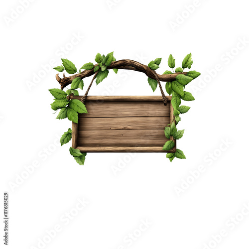 A wooden sign hanging from a branch with green leaves. on a white background
