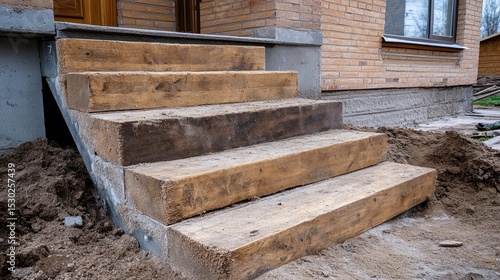 A wooden staircase with a brick wall in the background