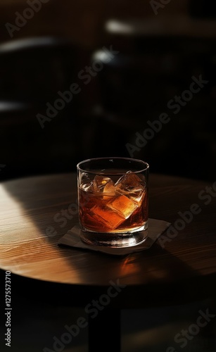 A wooden table featuring an old-fashioned cocktail, softly illuminated by warm, ambient light.