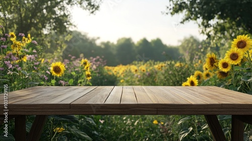 A wooden table in a vibrant flower field, bathed in soft sunlight.