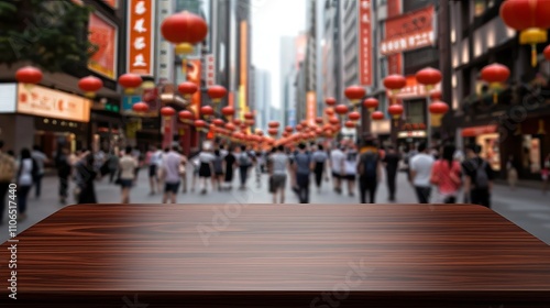 A wooden table in the foreground with a bustling city street adorned with red lanterns in the background.
