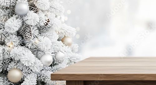 A wooden table stands in front of a softly blurred, snow-covered Christmas tree with festive ornaments.