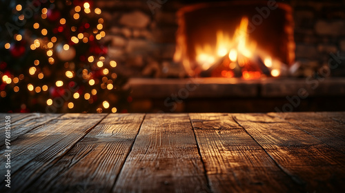 a wooden table with a a fireplace in the background and a festively decorated living room