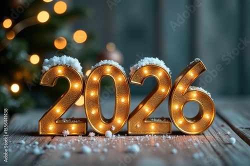 A wooden table with a lighted sign featuring the year 2016, perfect for adding a vintage touch to any setting..New Year 2026.
