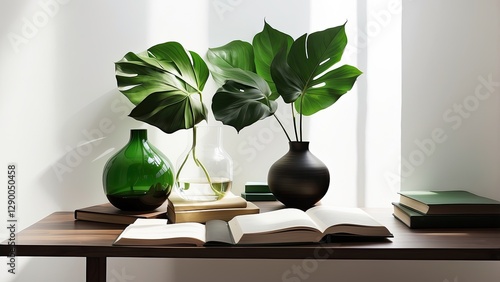A wooden table with a stack of books and a small, decorative bowl on top of one
